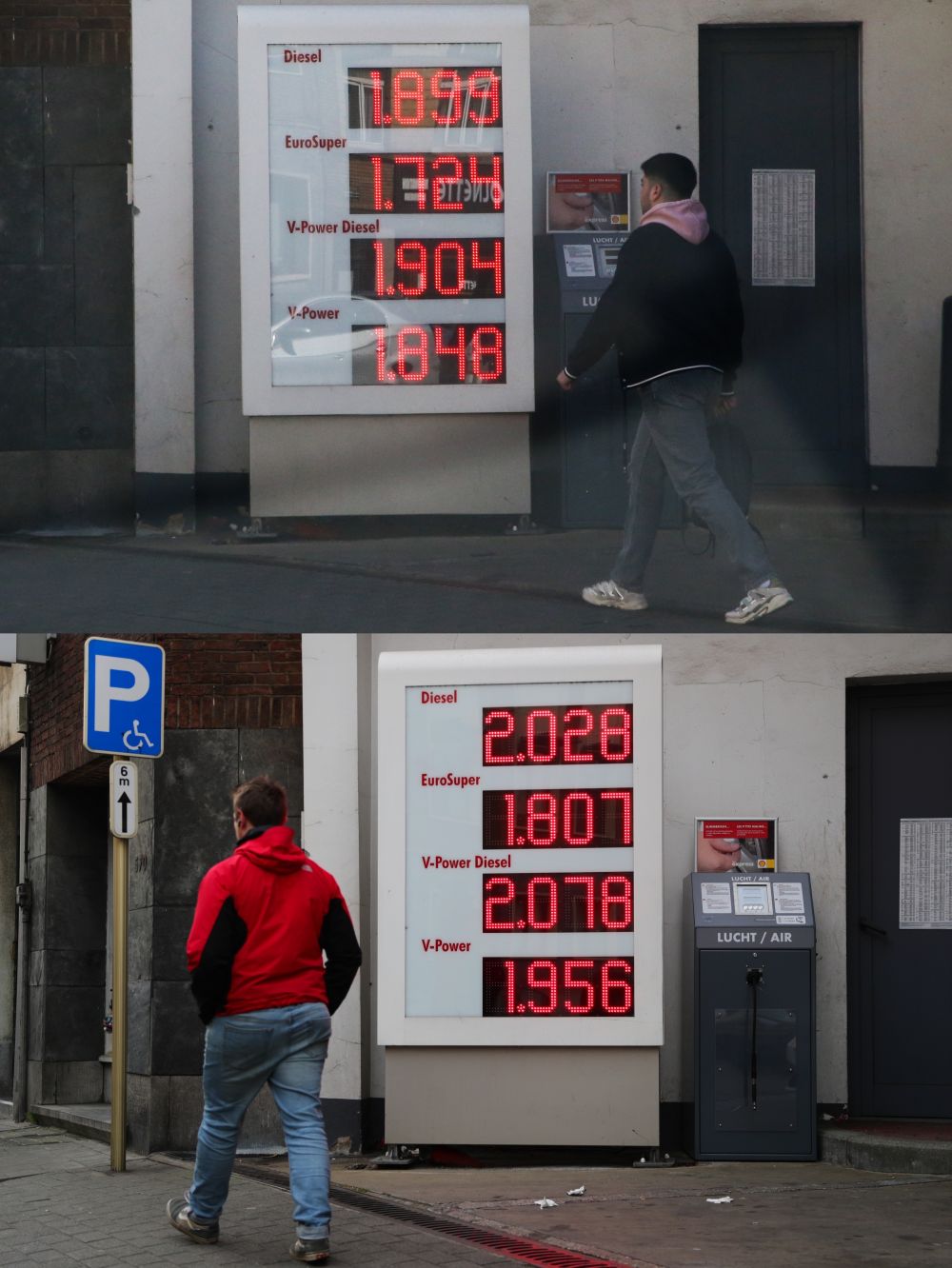 拼版照片显示,在比利时布鲁塞尔的同一个加油站,2022年3月29日(下)的燃油价格较2022年3月23日(上)有所上涨。