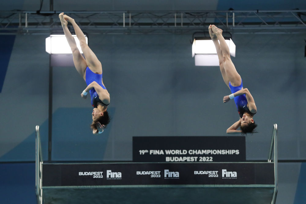 2022年6月30日,陈芋汐(左)/全红婵在匈牙利布达佩斯举行的2022年世界游泳锦标赛跳水项目女子双人10米台决赛中。
