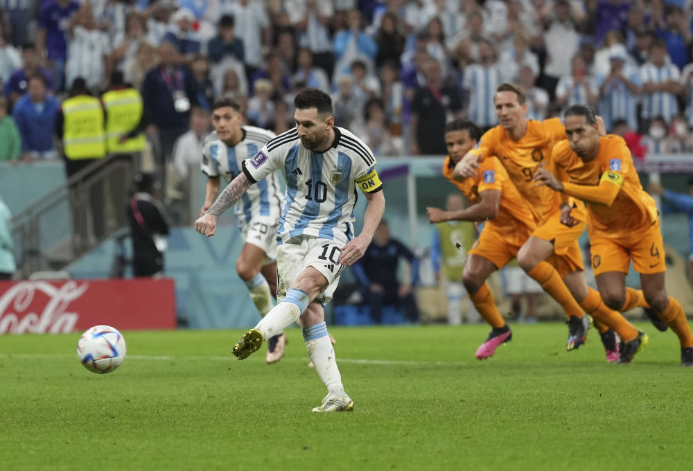2022年12月9日,阿根廷队球员梅西(前)在2022卡塔尔世界杯足球赛四分之一决赛中主罚点球得分。