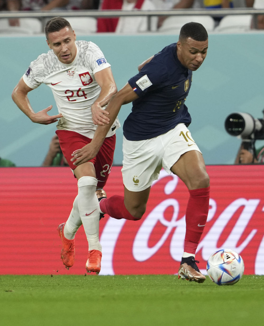 2022年12月4日,法国队球员姆巴佩(右)在2022卡塔尔世界杯足球赛八分之一决赛法国队与波兰队的比赛中突破。