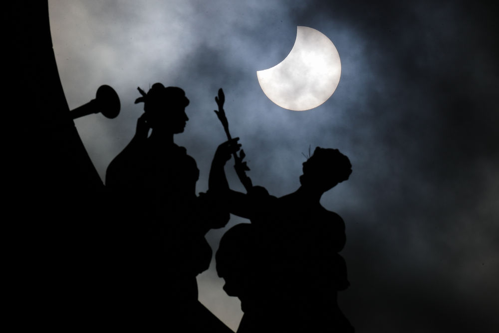 2022年10月25日在比利时布鲁塞尔五十周年纪念公园拍摄的日偏食。