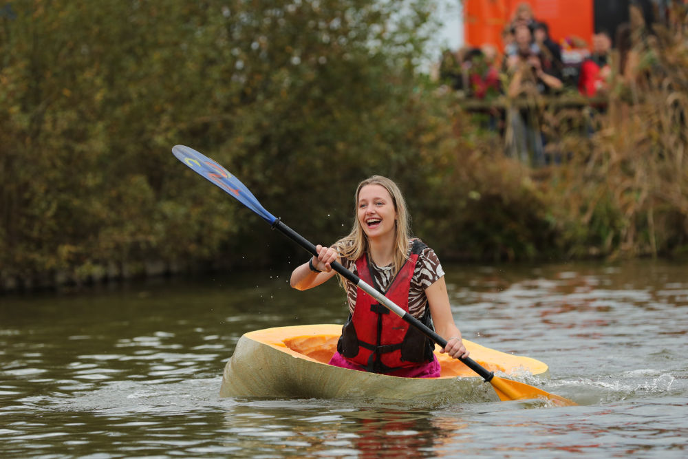 2022年10月23日,一名女子在比利时卡斯特莱市利赫塔尔特村参加划南瓜船比赛。