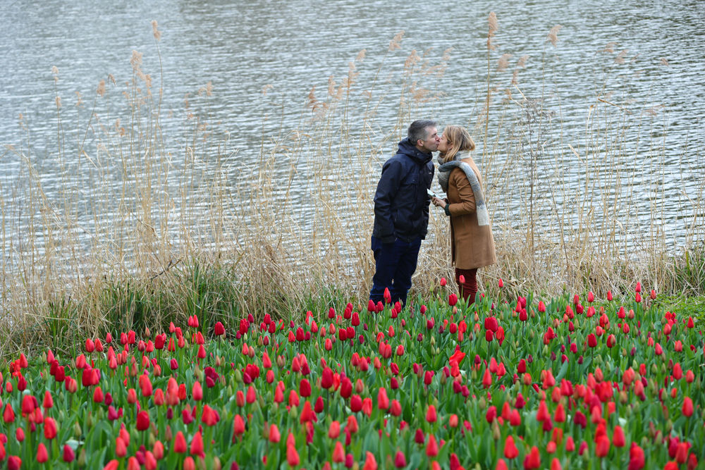 2022年4月2日,一对情侣在比利时布鲁塞尔市以西的拜加登城堡园林的花丛旁亲吻。