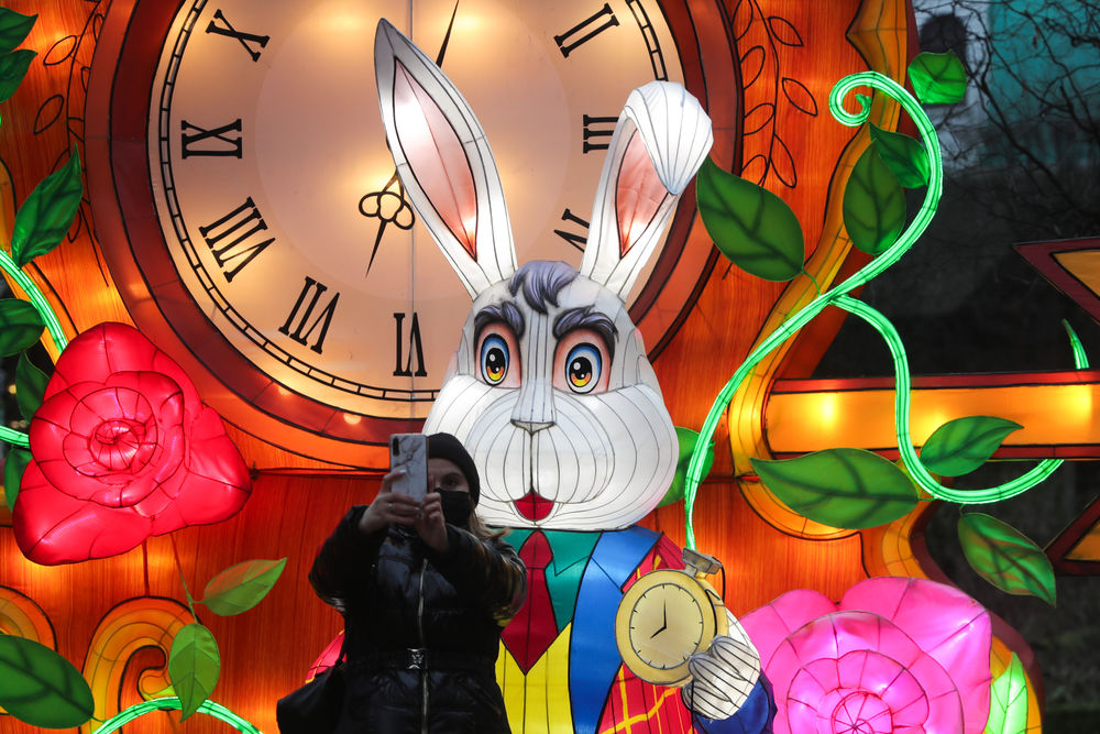 2022年1月12日,一名游客在比利时安特卫普动物园举行的第六届“中国花灯节”上自拍。