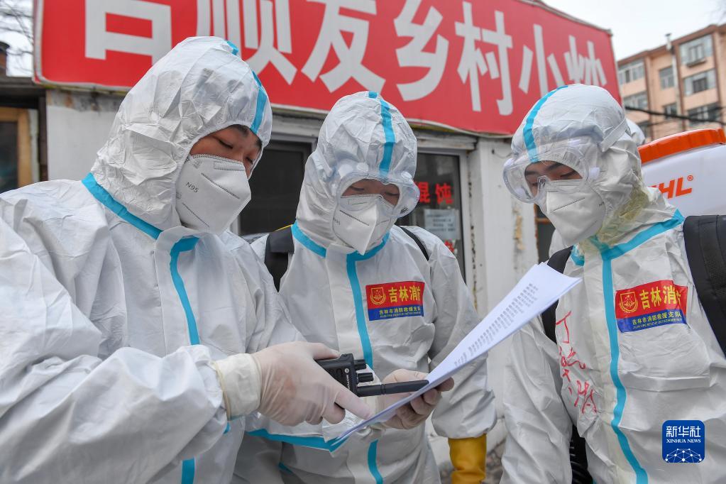 2022年3月18日,吉林省吉林市消防救援支队党员先锋突击队队员在进行社区消杀工作安排。新华社记者 张楠 摄