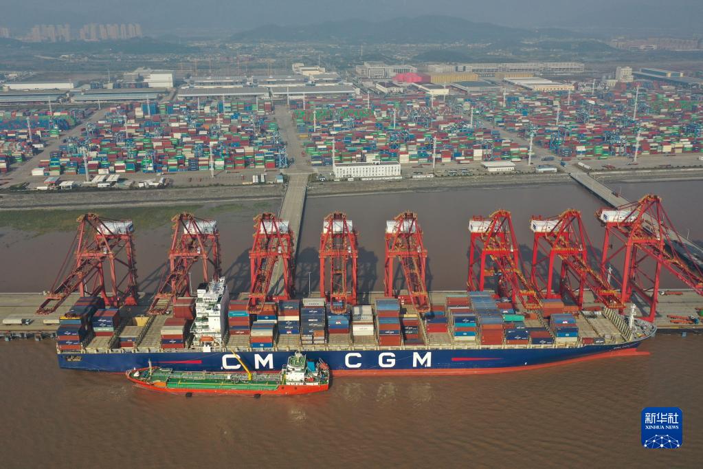 2022年12月13日,货轮停靠在浙江宁波舟山港梅东码头(无人机照片)。新华社记者 黄宗治 摄