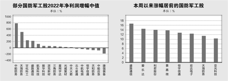 以预告区间中值或快报数据统计,中船防务、天海防务、甘化科工、盛路通信、航发科技2022全年净利润有望翻倍;振华科技、派克新材、三角防务等个股净利润增幅均有望在50%以上。