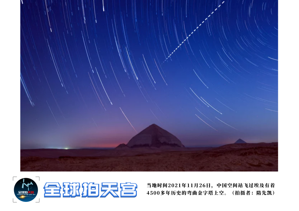 隋先凯:当中国空间站从金字塔上空出现时,我激动地大叫起来,我大声地呼喊着她的名字,向空间站内的航天员表达问候。她犹如一颗“流星”,闪耀着划过夜空,渐而消失远方,而我的激动心情久久不能平复。