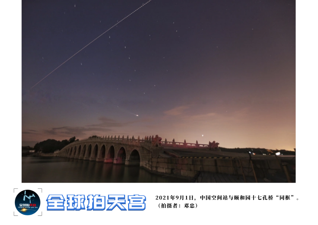 中国空间站与颐和园十七孔桥“同框”。颐和园十七孔桥“金光穿洞”奇观每年都会吸引众多游客前往“追光”。