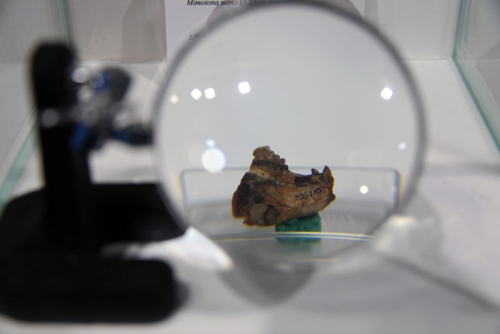 中国古动物馆《“兔年话兔”——兔年特展》中的安徽模鼠兔上颌骨化石。新华社记者 任超 摄