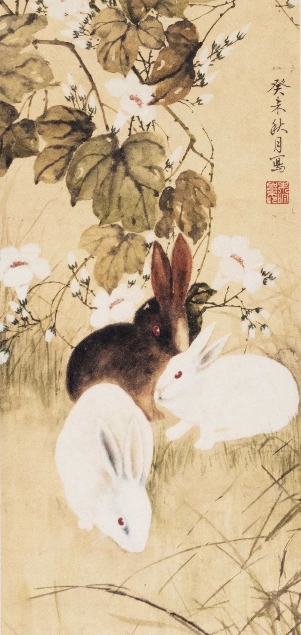 北京自然博物馆“大展宏‘兔’——癸卯(兔年)新春生肖文物图片联展”中的《吟絮花卉白兔》图(局部)。新华社记者 谢晗 摄