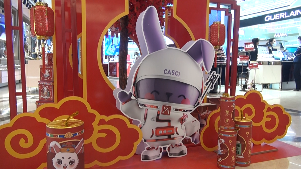 图为北京颐堤港内,中国探月航天IP形象“兔星星”正在与游客互动。(受访者供图)