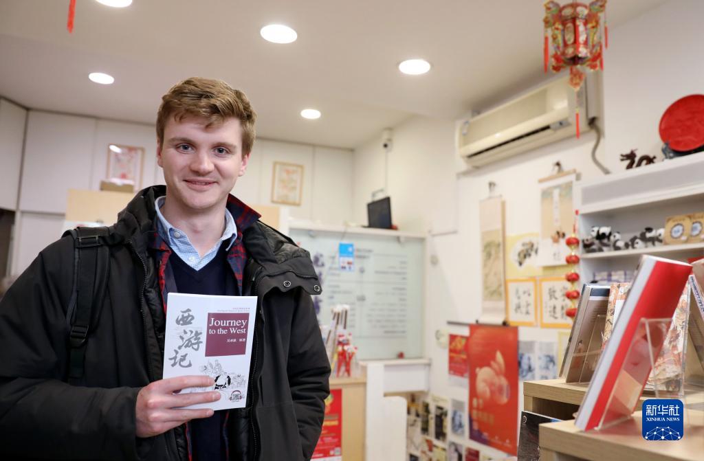 1月24日,26岁教师杰克·弗劳尔斯在位于英国伦敦的光华书店内展示刚刚购买的图书《西游记》。新华社记者李颖摄