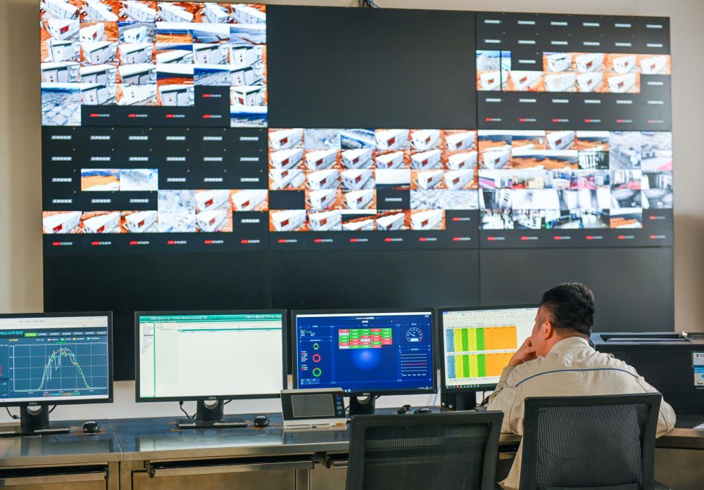 ↑2022年4月20日,在达拉特光伏发电应用领跑基地,工作人员在运维中心主控室工作。