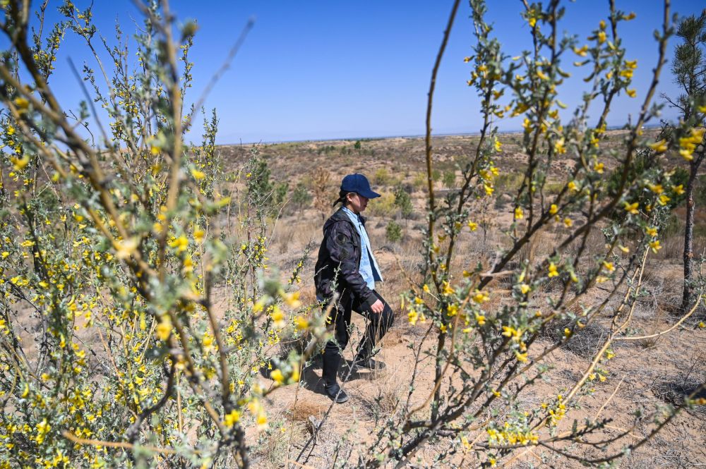 ↑2022年4月30日,李芳在银肯塔拉生态旅游区为营地旅游项目选址。 新华社记者刘磊摄