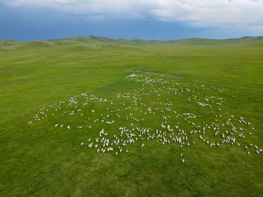 ↑在内蒙古东乌珠穆沁旗的草原上拍摄的羊群(2022年7月27日摄)。