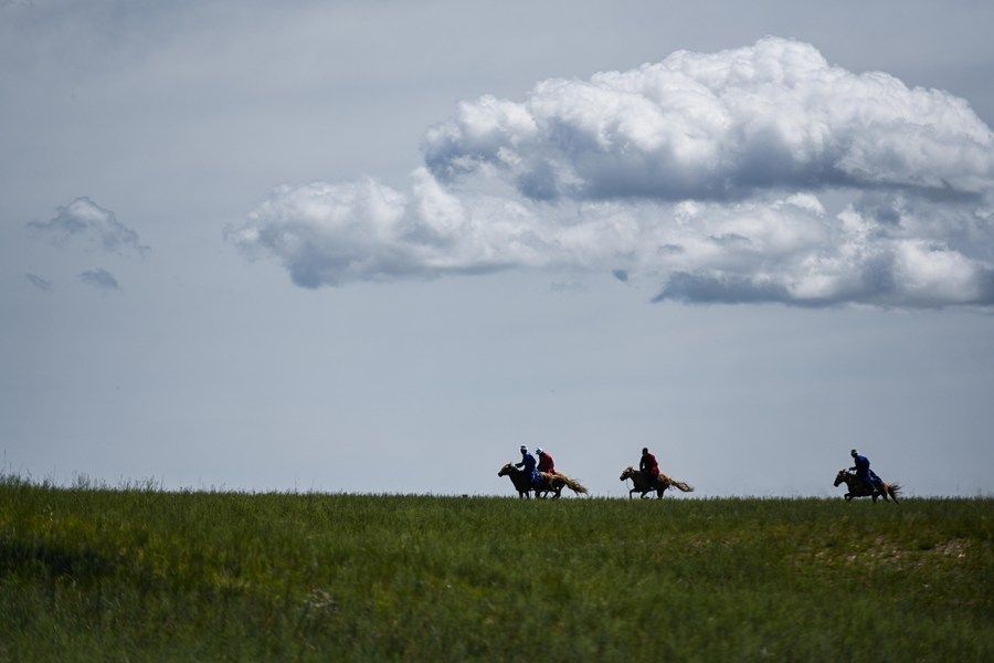 ↑2022年7月28日,牧民驰骋在内蒙古东乌珠穆沁旗的草原上。