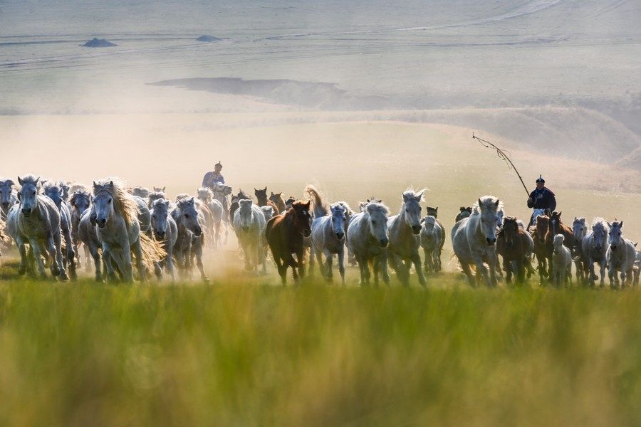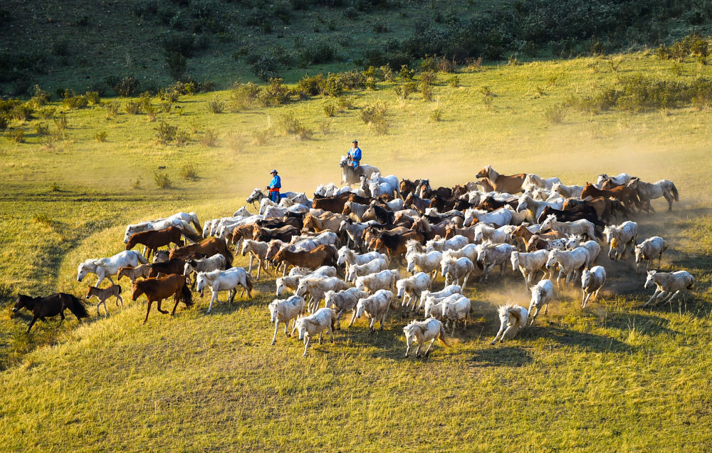 ↑2022年5月17日,锡林郭勒盟西乌珠穆沁旗的牧民在驱赶马群。 新华社记者彭源摄