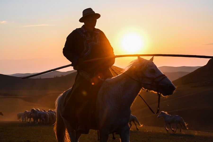 ↑2022年6月26日,牧民在内蒙古呼伦贝尔市新巴尔虎左旗道乐都夏营地放牧。