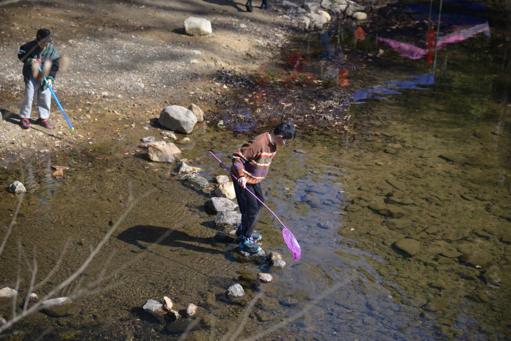 清澈的溪水深受游客们青睐。新华社记者李昊泽 摄