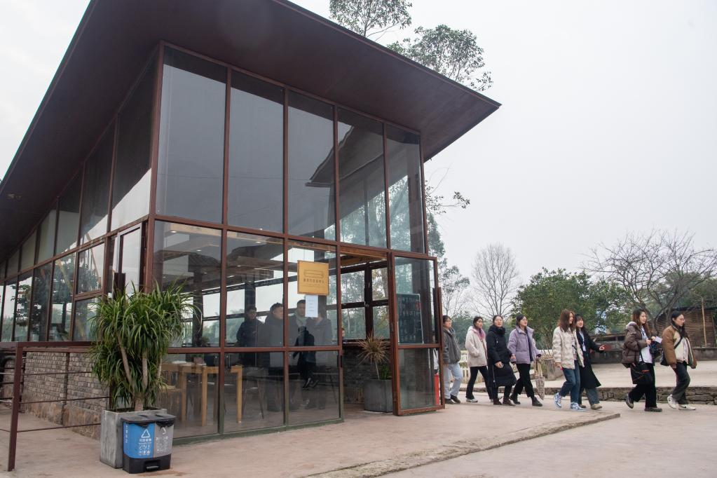 2月3日,在重庆市璧山区七塘镇将军村,大学生游客从一家由村舍改造的咖啡屋前走过。新华社记者唐奕 摄