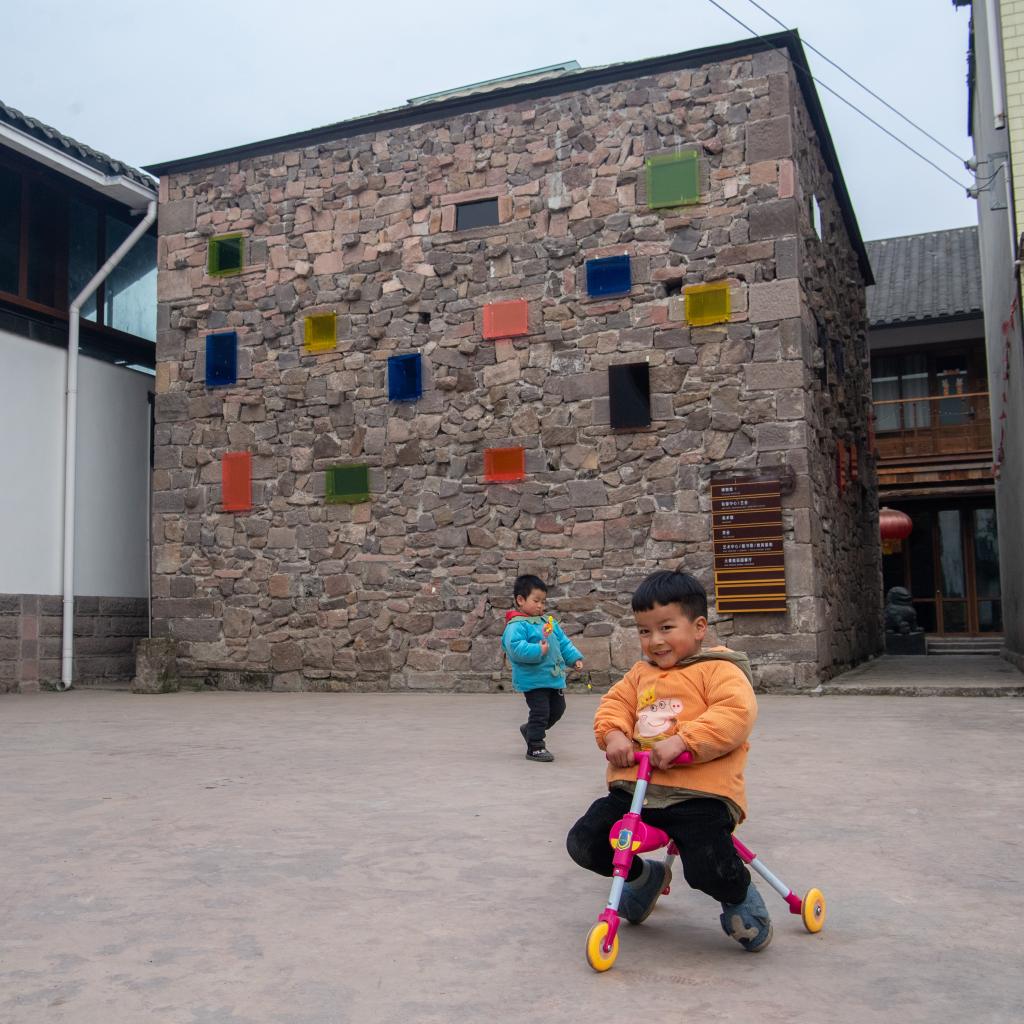 2月3日,在重庆市璧山区七塘镇将军村,小朋友在“艺术活化”的村舍前玩耍。新华社记者唐奕 摄