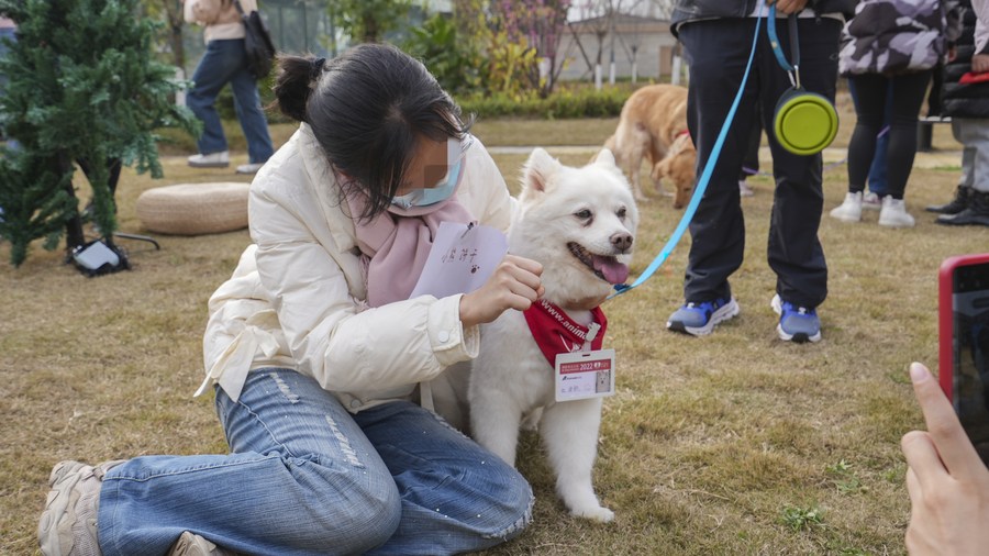 2月9日下午,在成都市心理健康中心,“狗狗医生”“李大宝”和患者互动。新华社发