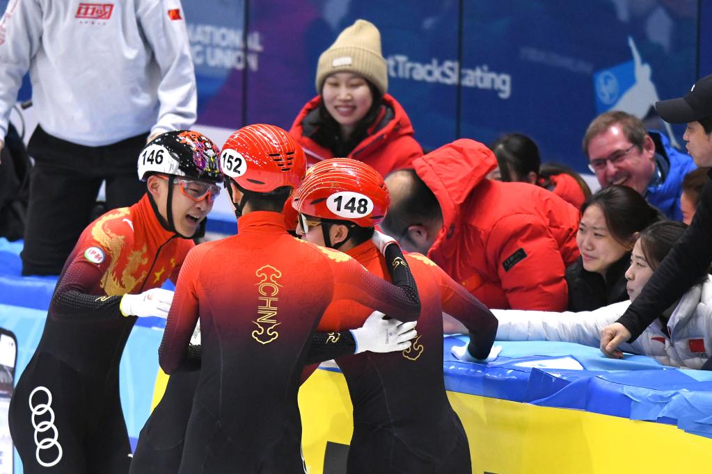 ↑2月5日,中国队选手在德国德累斯顿站获得男子5000米接力冠军后庆祝