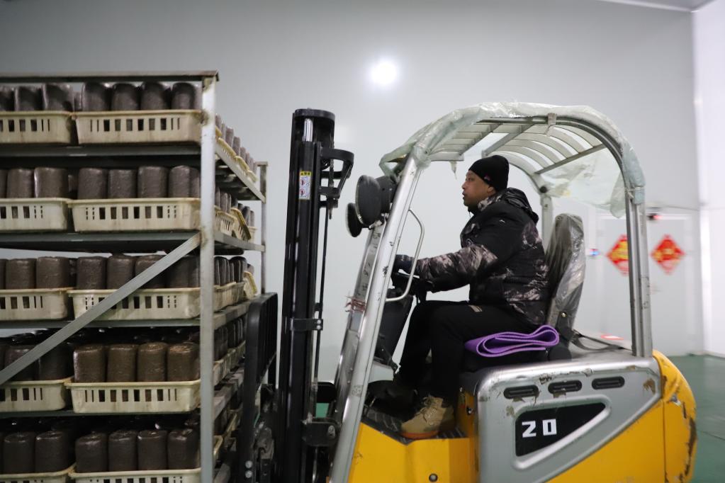 双鸭山南瓮泉种养殖有限公司养菌室内,工作人员正在操作叉车运输菌包。新华社记者 戴锦镕 摄