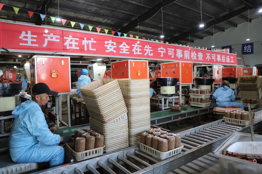 双鸭山南瓮泉种养殖有限公司加工车间内,工作人员正在打包菌包。新华社记者 戴锦镕 摄