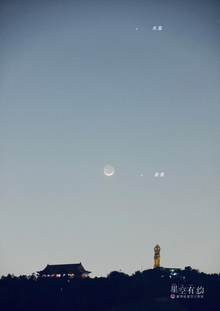 广东省天文爱好者沈权智2023年2月22日傍晚在广州番禺莲花山拍摄的金木伴月。(本人供图)