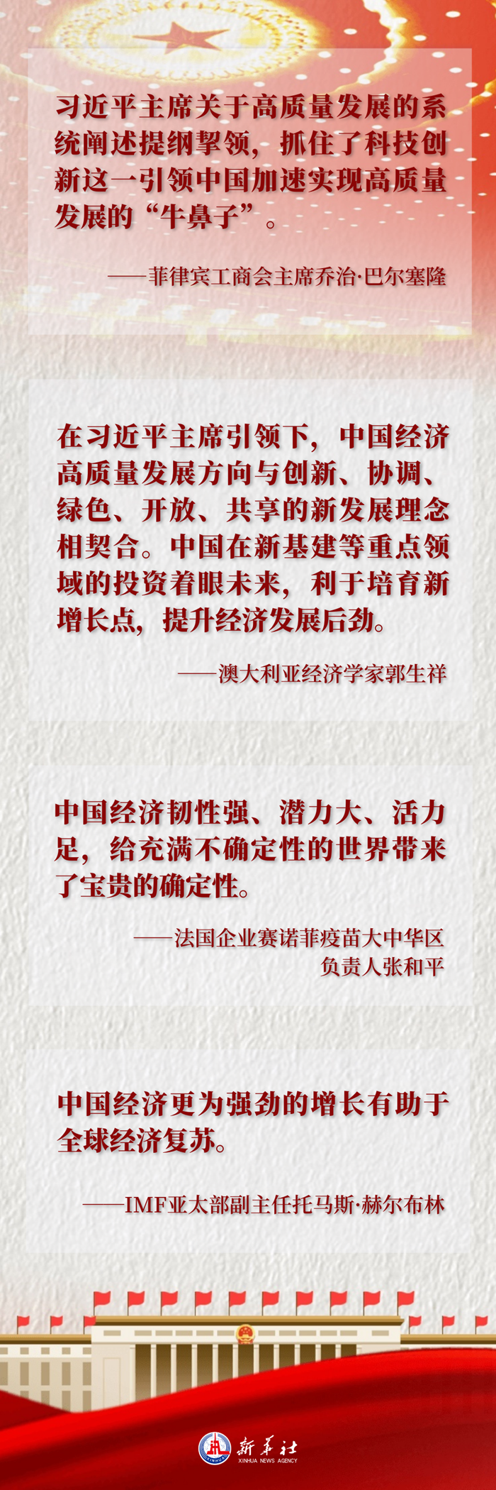 “在习近平主席引领下,中国经济高质量发展方向与创新、协调、绿色、开放、共享的新发展理念相契合。”澳大利亚经济学家郭生祥指出,“中国在新基建等重点领域的投资着眼未来,利于培育新增长点,提升经济发展后劲。”