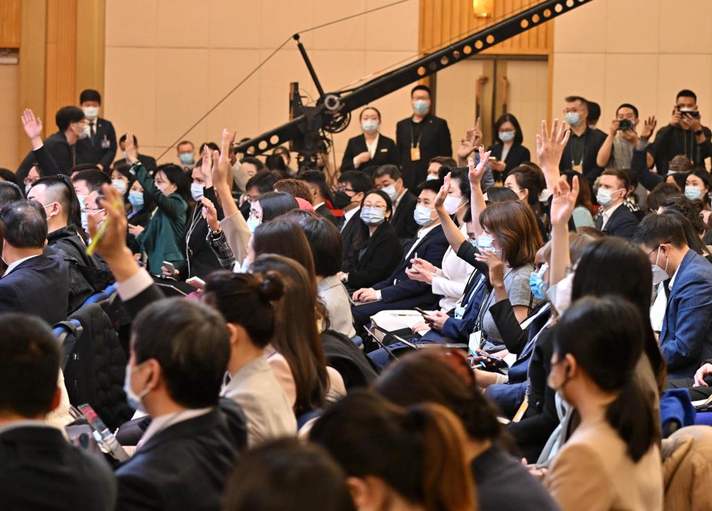 3月7日,十四届全国人大一次会议在梅地亚中心举行记者会,外交部长秦刚就中国外交政策和对外关系回答中外记者提问。这是记者在现场举手提问。新华社记者 李鑫 摄