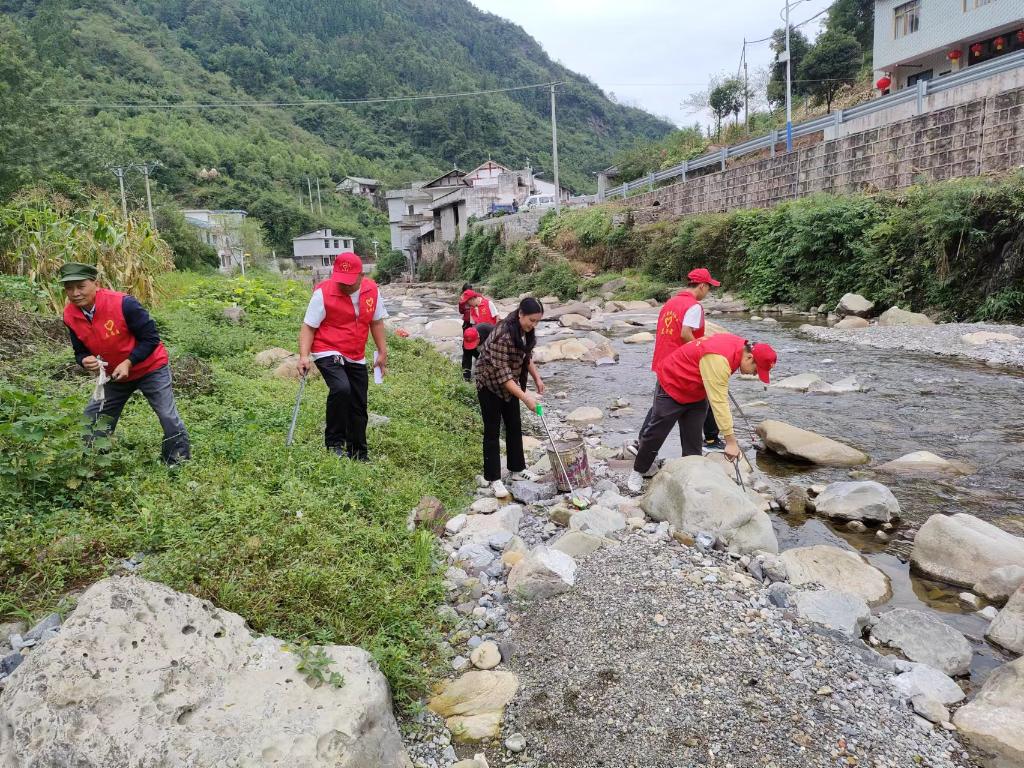 威信县双河乡楠木村党总支书记杨敏(中)和党员、志愿者捡拾河岸垃圾。(郭祥琼 摄)