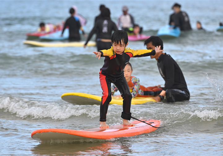 ↑小朋友在海南万宁日月湾体验冲浪。新华社记者郭程摄