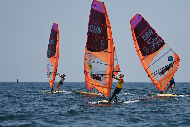 ↑东京奥运会女子帆板RS:X级比赛现场。新华社记者黄宗治摄