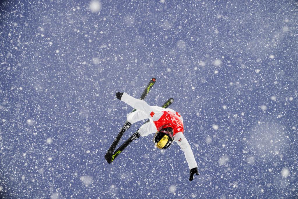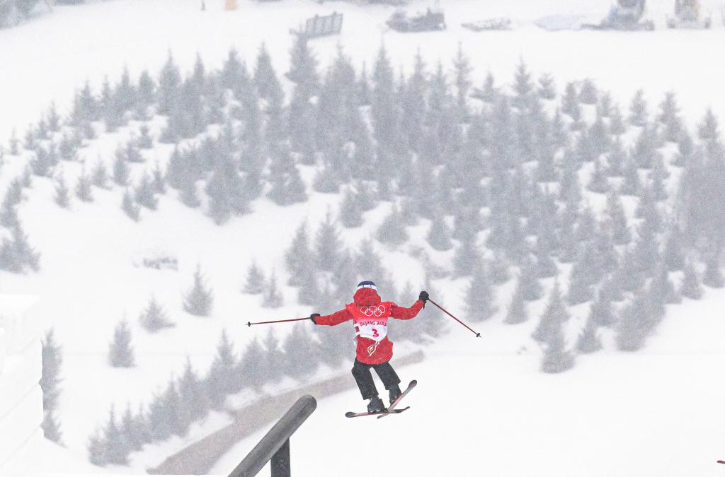 ↑2022年2月13日,谷爱凌在赛前训练中。当日,原定于上午10时举行的北京2022年冬奥会自由式滑雪女子坡面障碍技巧资格赛因天气原因推迟。新华社记者肖艺九 摄