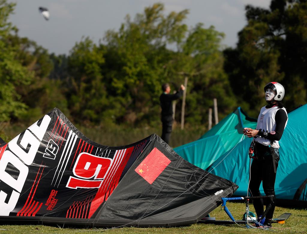 ↑2018年10月14日,原定于当日参加比赛的中国选手陈静乐在岸上整理装备。当日,布宜诺斯艾利斯青奥会帆船帆板项目女子风筝板比赛因天气原因推迟举行。新华社记者王丽莉摄