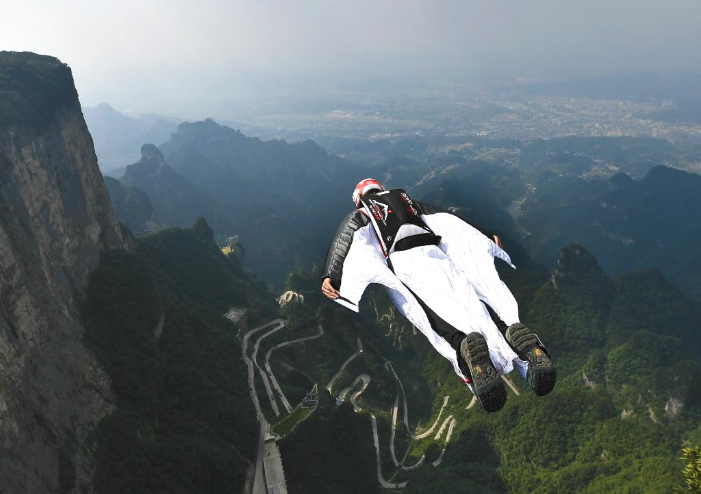 ↑翼装飞行运动员在张家界天门山试飞。新华社发(邵颖摄)