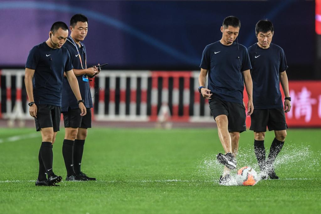 ↑2020年8月15日的一场中超联赛比赛因大雨导致场地条件不适合进行比赛而延期。图为裁判组查看场地情况。新华社记者潘昱龙摄