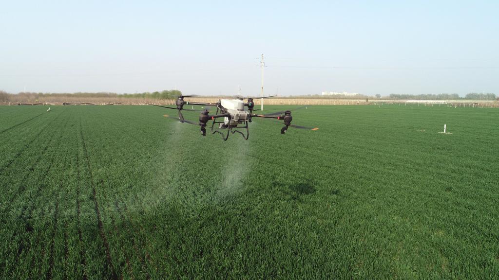 河北省馆陶县樊堡村种粮户在用无人机给小麦喷洒药物。新华社记者 赵鸿宇 摄
