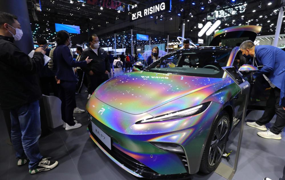 4月24日,参观者在2023第二十届上海国际汽车工业展览会飞凡F7展车边驻足观看。新华社记者 方喆 摄