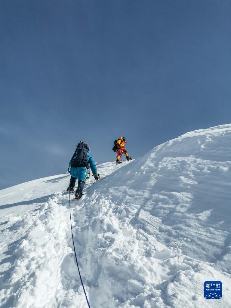 董红娟(前)在攀登希夏邦马峰的途中(4月26日摄)。新华社发(顿巴 摄)