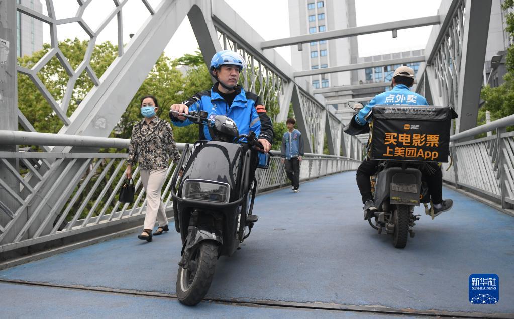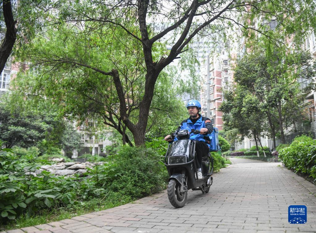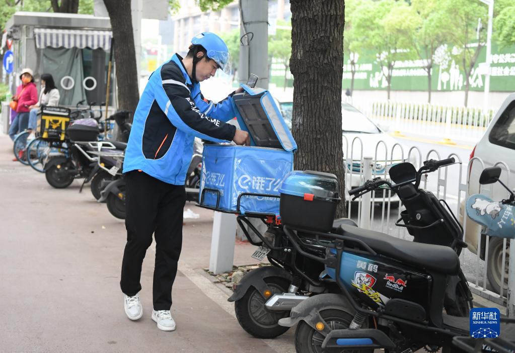 郭锋在小区里送外卖(4月28日摄)。新华社记者 程敏 摄
