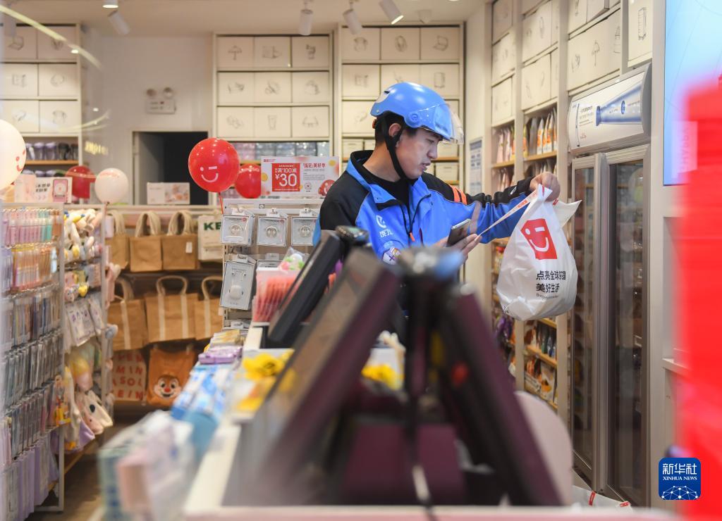 郭锋在一家商场店铺取到外卖订单物品,准备送货(4月28日摄)。新华社记者 程敏 摄