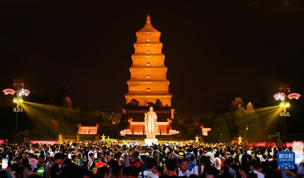 5月1日,游客在西安大唐不夜城步行街游览。新华社发(邹竞一 摄)
