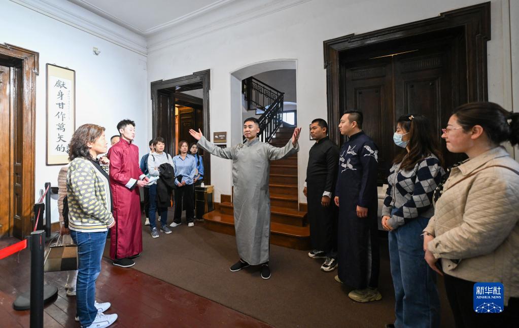 4月29日,在天津市河北区梁启超纪念馆饮冰室,话剧演员与游客进行互动式沉浸演出。新华社记者 孙凡越 摄