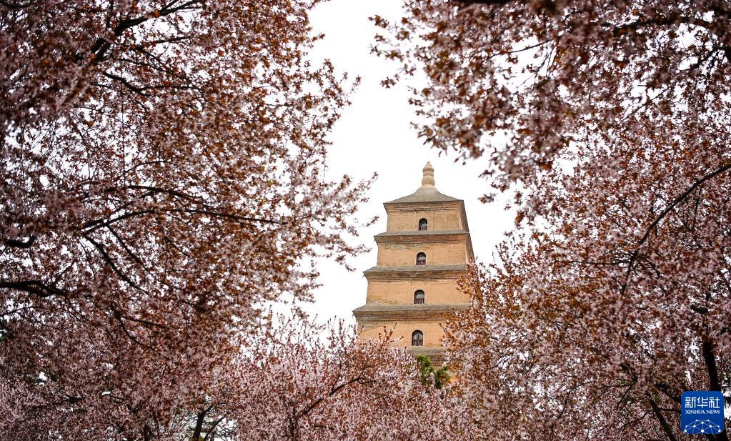 春花掩映中的西安大雁塔(4月1日摄)。