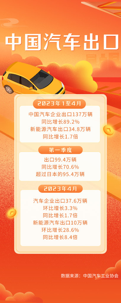 中国汽车工业协会的统计数据显示,今年第一季度,国内汽车企业出口99.4万辆,同比增长70.6%,超过日本的95.4万辆。最新数据显示,4月份,出口37.6万辆,同比增长1.7倍,其中,电动、混动等新能源汽车出口10万辆,环比增长28.6%,同比增长8.4倍,保持良好势头。
