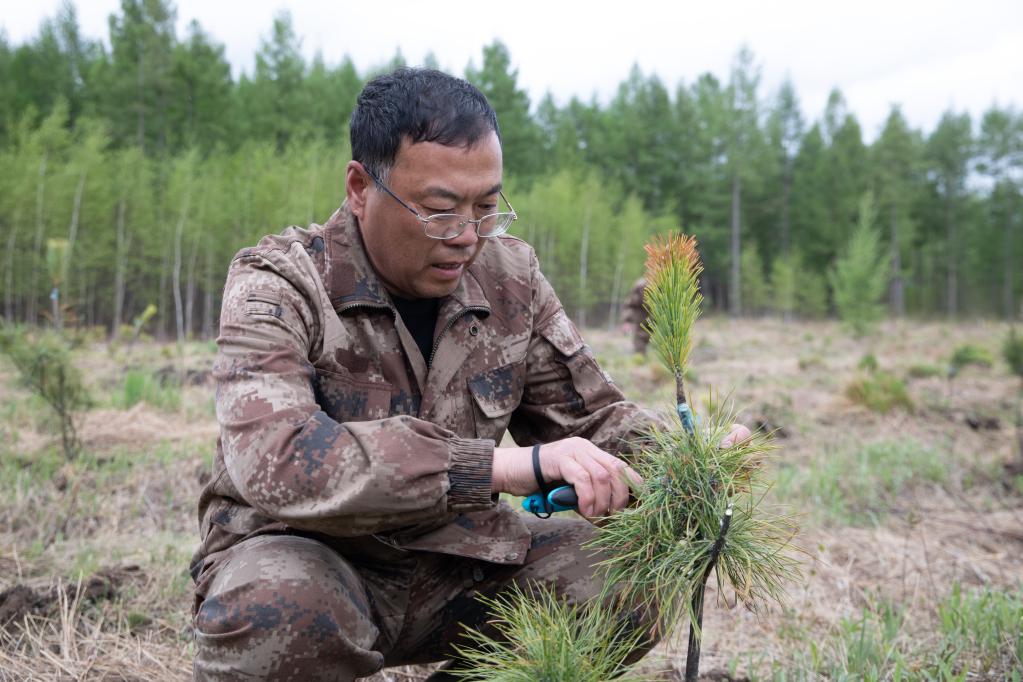 5月21日,在伊春森工红星林业局公司五星河林场分公司红松兼果林基地,工作人员在养护红松嫁接苗。 新华社记者 张涛 摄